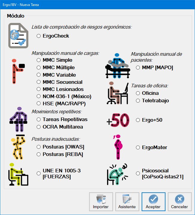 Software de evaluación y recomendaciones de diseño, relacionado con el lugar de trabajo a riesgos ergonómicos y psicosociales en el lugar de trabajo. Adecuado para profesionales de prevención y salud laboral. La aplicación de referencia para expertos en prevención y salud laboral cuenta con agentes especialistas en ergonomía. OCRA * REBA * OWAS * NIOSH * MAC * RAPP * ART *